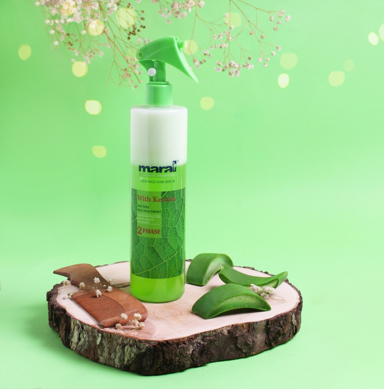 سرم موی دوفاز ضد وز مارال حاوی آلوئه ورا یک سرم فوقالعاده برای کسانی که علاقهمند هستند در کنار رنگ کردنهای مداوم و متنوع خود، زیبایی و طراوت موهایشان را از دست ندهند محسوب میشود. در کنار استفاده از رنگ و دکلره نیاز است تا از محصولات تقویتی استفاده نمایید تا همیشه موهایی لطیف و براق داشته باشید. این سرم مو از برند مارال دارای پرو ویتامین B۵ جهت آبرسانی به تارهای مو، حاوی آلوئه ورا با هدف آبرسانی به ساقه موها و جلوگیری از وز شدن و حاوی کراتین جهت ترمیم و بازسازی موها است. این محصول با نرم کردن فولیکولهای موی سر، حالتی کاملا مرتب و یکدست ایجاد میکند.