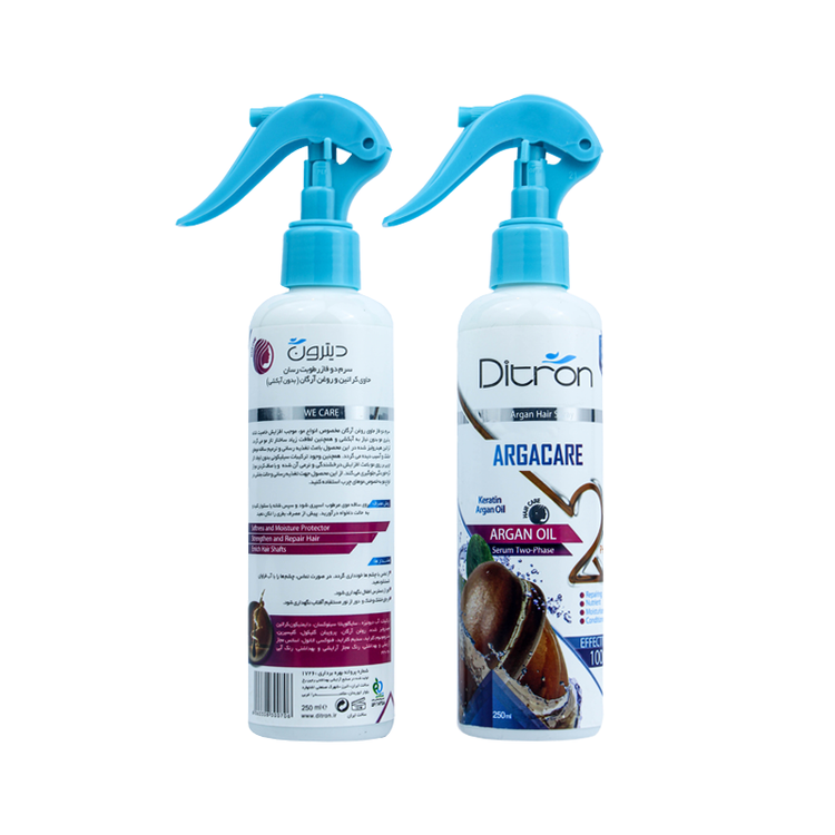 سرم دو فاز رطوبت رسان دیترون حاوی کراتین و روغن آرگان برای انواع مو حتی موهای چرب هم مناسب است و دارای اپلیکاتور اسپری بوده که به راحتی میتوان سرم را روی موهای خود اسپری کنید. کراتین هیدرولیز شده در این محصول ساقه موهای خشک و آسیب دیده را ترمیم و تغذیه میکند. همچنین وجود ترکیبات سیلیکونی موجود در این سرم مو بدون ایجاد هیچ گونه چربی روی مو، سبب افزایش درخشندگی و نرمی موها شده و با صاف کردن آنها از گره خوردن مو جلوگیری میکند. روغن آرگان این محصول بافت مو را نرم و لطیف کرده و سبب افزایش خاصیت شانه پذیری مو میشود.
